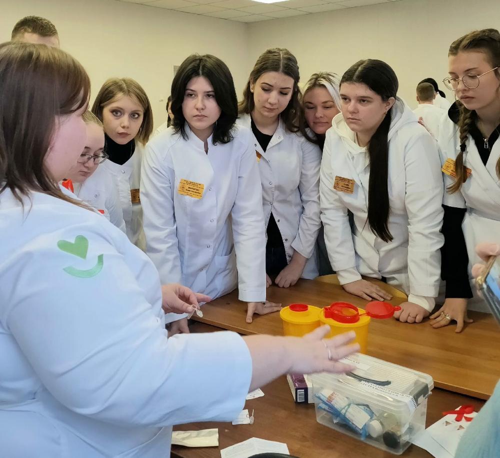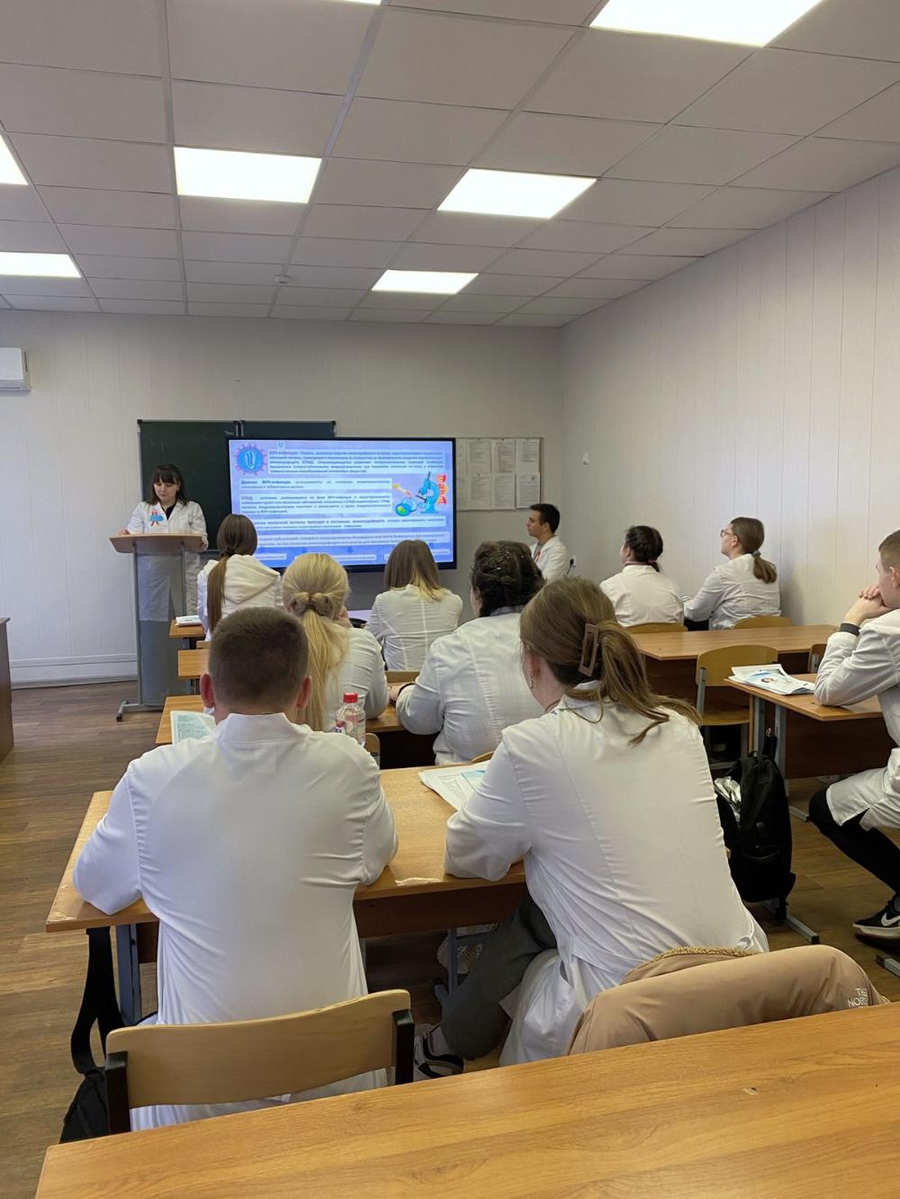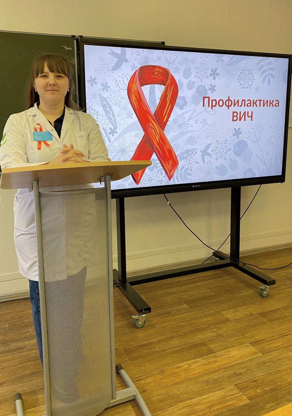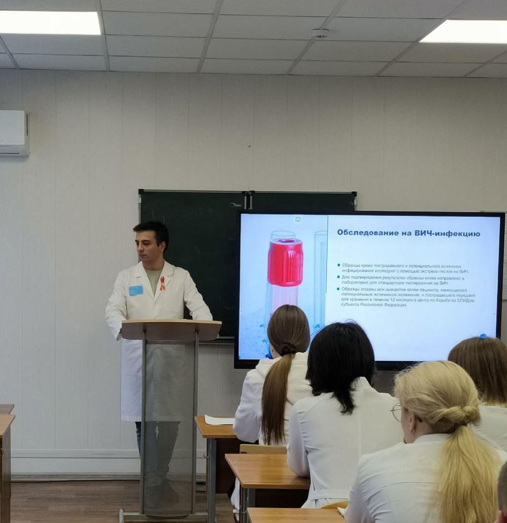 Для студентов медколледжа была запланирована насыщенная программа. Медицинская сестра филиала поликлиники Елена Васильевна Жмырова подготовила лекцию, посвящённую профилактике ВИЧ-инфекции. Внимание молодых людей обратили на то, что ВИЧ-инфекция давно вышла за пределы уязвимых групп населения, заразиться может каждый, поэтому важно знать пути распространения и меры предосторожности.