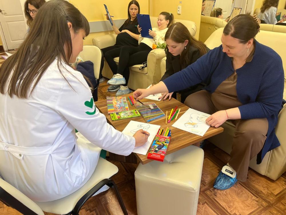 Интересный мастер-класс провела медицинский психолог Ольга Владимировна Баскакова, которая предложила женщинам взять в руки карандаши, фломастеры, проявить фантазию и нарисовать портрет самой красивой — беременной женщины. Ведь праздник был посвящён теме: самая красивая — это беременная женщина. А самое прекрасное на свете — находиться в состоянии ожидания встречи со своим ребёнком. Всем участницам праздника подарили розы, шарики, подарки и прекрасное настроение!