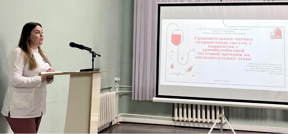 Тема звучала так: «Сравнительная оценка скоринговых систем у пациентов с тромбоэмболией лёгочной артерии на догоспитальном этапе». Доклад подготовила Ангелина Абрамян, врач-ординатор хирургического отделения №2.