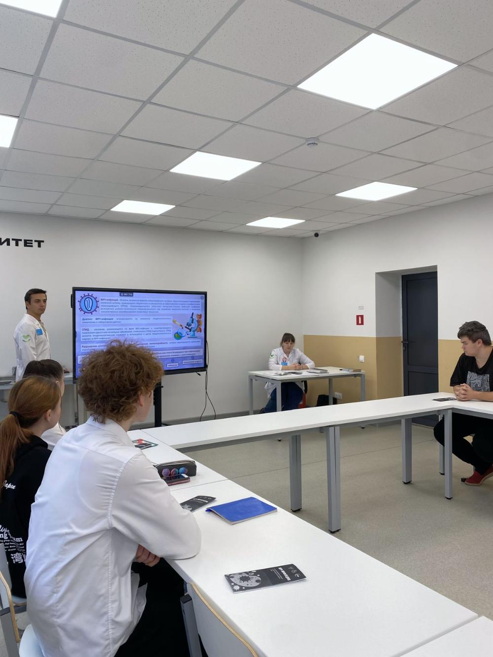 старшая медицинская сестра хирургического отделения Екатерина Васильевна Выжанова, старший медбрат терапевтического отделения №1 Андрей Владимирович Иванов и медицинская сестра Елена Васильевна Жмырова. Сотрудники ГКБ №3 подготовили для студентов лекцию, посвящённую профилактике ВИЧ-инфекции.